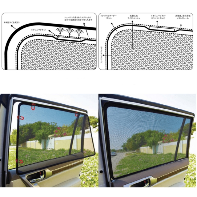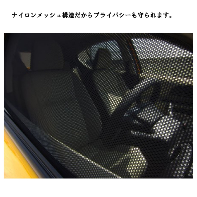 紫外線(UV)を67.1%カット、熱い外気の侵入を抑え、車内を快適に保ちます。エアコンの使用頻度を抑え、燃費や走行距離を向上させます。メッシュ構造のため外から車内の確認がし難くなり、車内のプライバシーもアップします。