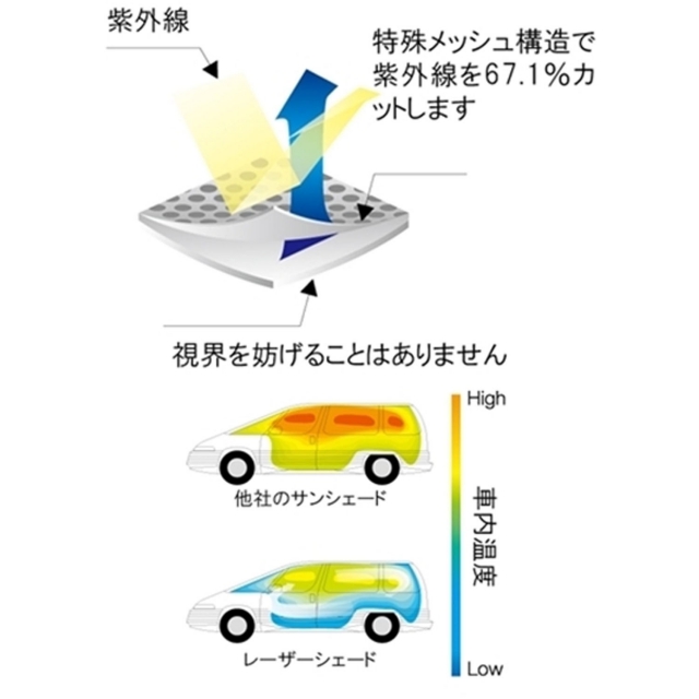 紫外線(UV)を67.1%カット、熱い外気の侵入を抑え、車内を快適に保ちます。エアコンの使用頻度を抑え、燃費や走行距離を向上させます。メッシュ構造のため外から車内の確認がし難くなり、車内のプライバシーもアップします。