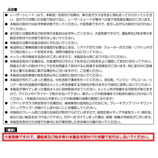 特許取得のシェード本体に内蔵されたマグネットマウントで、誰でも素早く簡単に、取り付けや取り外しが可能 。最新の3Dレーザースキャン技術と、CADによるデジタル処理で、車両ごとの完璧なフィットを実現しました。車種別専用設計のため、窓枠にジャストフィット、装着したまま窓の開閉可能です。