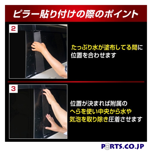 【形状】※純正バイザー装着車用※お車の仕様をご確認の上、ご購入ください。本商品は巻き込みではございません。表面のみに貼る形状となっております。剥がれ防止の為、パーツの端まで貼り込むことは出来ません。