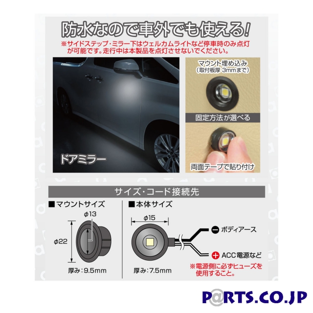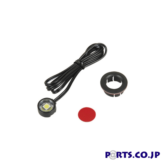 【仕様】・DC12V車専用・消費電流:20mA・発光色:白・防水性能:IPX6相当・コードのサイズ:60㎝X0.2sq相当・LEDサイズ:Φ15mm・マウント取り付け穴径:Φ17mm・取り付け板厚:MAX3mm 【内容物】・防水ワイドLED:1個・専用マウント:1個・両面テープ:1枚