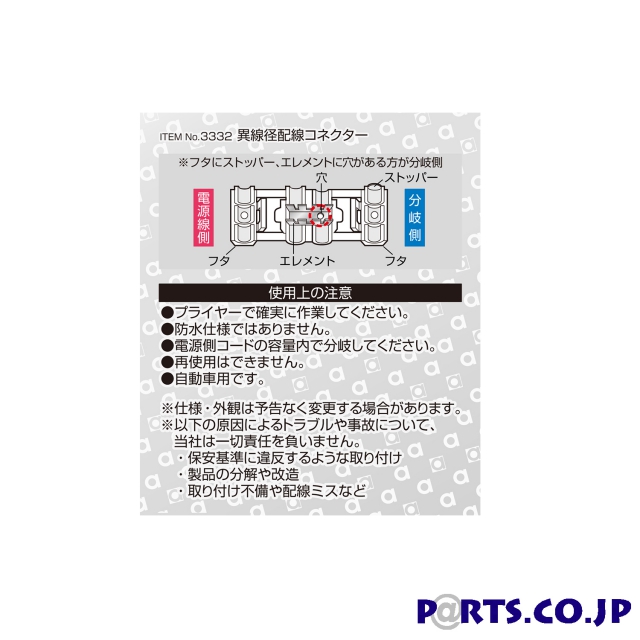 【仕様】・使用可能電力:DC12V車 36W以下DC24V車 72W以下・適合コードサイズ電源側:AV(S)0.5 0.85sq分岐側:AV(S)0.2 0.5sq