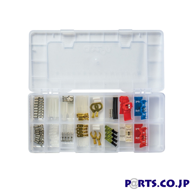 内容物・ギボシ端子…8セット・ギボシ端子ダブル…2セット・平型端子(250 型)…4セット・クワ型端子(φ6)…2セット・丸型端子(φ8)…2セット・配線コネクター(白)…2 個・配線コネクター( 薄赤)…2個・配線コネクター( 赤)…2個・配線コネクター( 青)…2個・接続コネクター…2セット(4個)・圧着接続端子収縮チューブ付…2セット