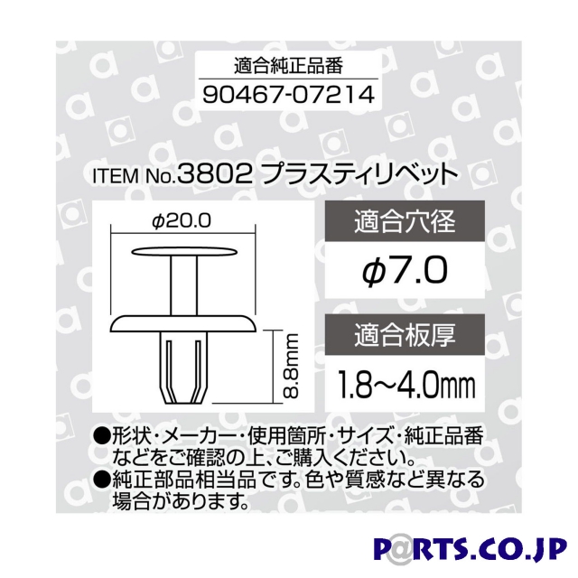 【仕様】・適合穴径:φ7.0・適合板厚:1.8 4.0mm・適合メーカー:トヨタ・適合純正品番90467-07214