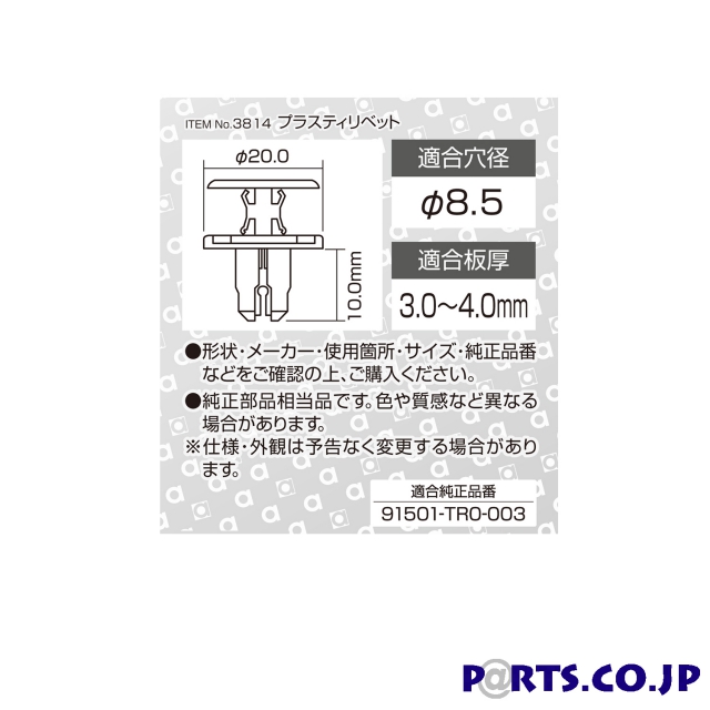 【仕様】・適合穴径:φ8.5・適合板厚:3.0 4.0mm・適合メーカー:ホンダ・適合純正品番91501-TR0-003