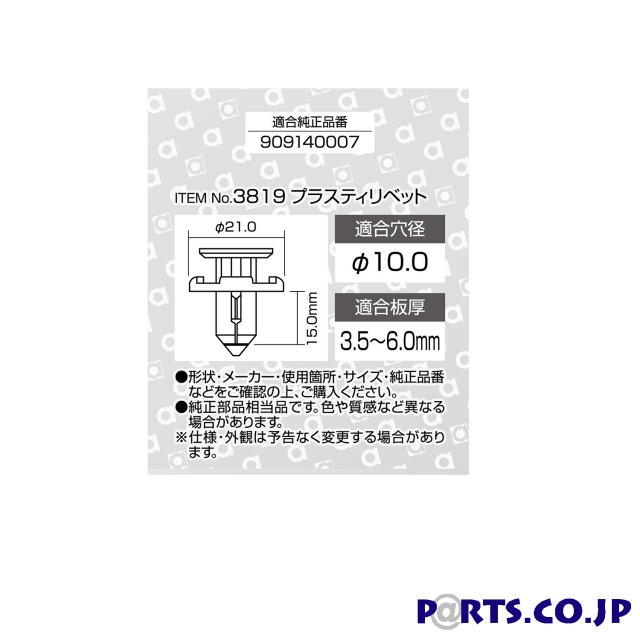 【仕様】・適合穴径:φ10.0・適合板厚:3.5 6.0mm・適合メーカー:スバル・適合純正品番909140007