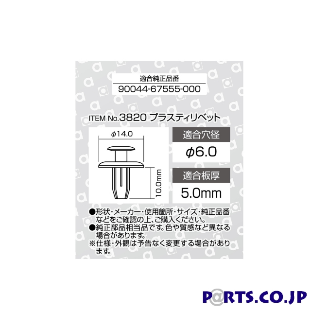 【仕様】・適合穴径:φ6.0・適合板厚:5.0mm・適合メーカー:ダイハツ・適合純正品番90044-67555-000