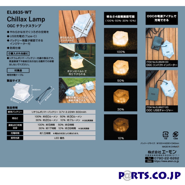 やわらかな光でくつろぎの空間を演出するLEDランタン。多面構造のメッシュ素材によりウォームホワイトの光がやわらかく拡散。暖かい光でくつろぎの空間を作り出し、癒しを与える。シーンに合わせた明るさ4段階調整。USB充電式(Type-C)で繰り返し使用できる。また、確実に充電できるのでキャンプの際等、満充電の状態で夕方から就寝時まで使用できます。(100%点灯:約5時間 )OGCの電源アイテムで充電できる。(item No.8623 OGC コントロールボックス、item No.8626 OGC コンパクトインバーター、item No.8627 OGC USBチャージャー)専用USB充電ケーブル付属で最大3個まで連結充電できる。※複数個同時充電した場合、単体充電時より充電時間が長くなります。バッテリー残量が一目で確認できるインジケーター付(5パターン)。点灯させたい時間に合わせて明るさを調整することができる。中芯入りでキレイに折りたため、ボックス等にも収納しやすいサイズに。また、使用時は天面側、底面側のベルトをそれぞれ引っ張って形を整える。ボタンベルト付き。収納時はまとめるベルトとして、使用時は吊り下げ用として使用できる。タープ、ロープ、車内のアシストグリップ、軽量なのでリュックサックなど、設置したい箇所に簡単に設置できる。防雨仕様で突然の雨や、夜露などを気にせず使用できる。保護回路(過充電、過放電、過電流)付。【ご購入される前に】リチウムポリマーバッテリー内蔵の製品です。高温環境下や直射日光の当たる箇所での保管はしないでください。【内蔵バッテリーについて】充電時の注意:充電機器によっては充電できない場合があります。その際は他の充電機器をお試しください。本体が濡れた状態では充電しないでください。廃棄時の注意:劣化した内蔵バッテリーは地域のルールにしたがって処理してください。一般家庭ごみとしては廃棄しないでください。【使用上の注意】■充電ポートのキャップは必ず真上から閉めてください。斜めから閉めると充電ポートが破損するおそれがあります。■充電ポートのキャップは充電時以外は必ず確実に閉めてください。■吊り下げて使用する場合は、必ず落下しない状態であることを確認してください。■本製品は防雨仕様です。水没する箇所や大量に水のかかる箇所で使用しないでください。■充電時には出力電力(5V)に対応した機器を接続してください。充電ができない、破損する可能性があります。■ご使用になる前に取扱説明書の「●充電方法」にしたがって必ず充電してください。■内蔵バッテリーの特性上、製品の点灯時間や充電能力は繰り返しの使用により低下していきます。■製品の上に荷重のかかるものを置かないでください。誤作動およびバッテリーに悪影響をおよぼすおそれがあります。■使用後は電源がOFFになっていることを確認してください。■本体が汚れた場合は、水拭きして乾燥させてください。アルコール系クリーナーは絶対に使用しないでください。■以下のような箇所での使用・保管はしないでください。・温度、湿度の特に高い場所・極端に低温な場所・直射日光の当たる場所■用途以外の使用はしないでください。※仕様・外観は予告なく変更する場合があります。購入される前にホームページをご確認ください。※製品の分解や改造によるトラブルや事故について、当社は一切責任を負いません。