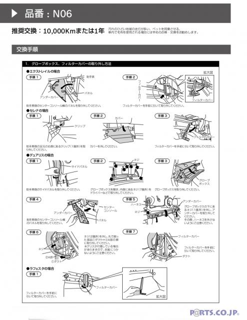 ※必ず適合(車種、年式、形式等)をご確認の上お買い求めください。※作業手順は例であり、実写と異なる場合があります。※製品に同梱されている取扱説明書の「取付・使用上の注意事項」をお読みください。※使用済のエアコンフィルターを清掃して再利用することは出来ません.