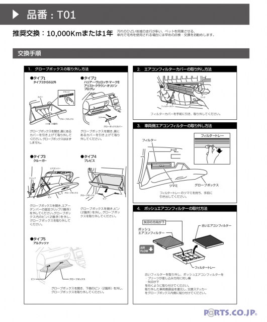 ※必ず適合(車種、年式、形式等)をご確認の上お買い求めください。※作業手順は例であり、実写と異なる場合があります。※製品に同梱されている取扱説明書の「取付・使用上の注意事項」をお読みください。※使用済のエアコンフィルターを清掃して再利用することは出来ません.