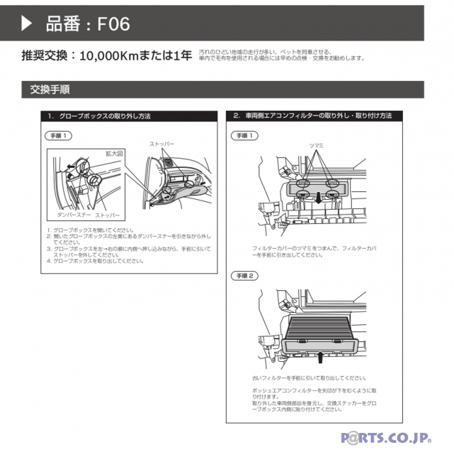 ※必ず適合(車種、年式、形式等)をご確認の上お買い求めください。※作業手順は例であり、実写と異なる場合があります。※製品に同梱されている取扱説明書の「取付・使用上の注意事項」をお読みください。※使用済のエアコンフィルターを清掃して再利用することは出来ません.