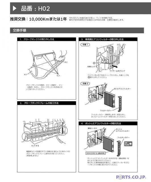 ※必ず適合(車種、年式、形式等)をご確認の上お買い求めください。※作業手順は例であり、実写と異なる場合があります。※製品に同梱されている取扱説明書の「取付・使用上の注意事項」をお読みください。※使用済のエアコンフィルターを清掃して再利用することは出来ません.