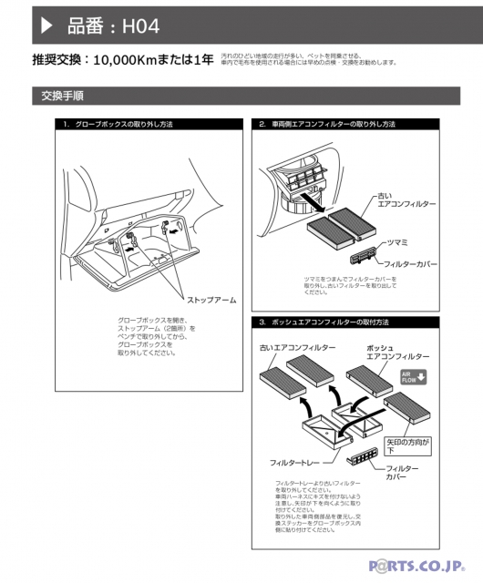 ※必ず適合(車種、年式、形式等)をご確認の上お買い求めください。※作業手順は例であり、実写と異なる場合があります。※製品に同梱されている取扱説明書の「取付・使用上の注意事項」をお読みください。※使用済のエアコンフィルターを清掃して再利用することは出来ません.