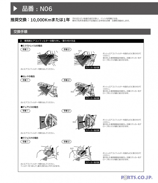 ※必ず適合(車種、年式、形式等)をご確認の上お買い求めください。※作業手順は例であり、実写と異なる場合があります。※製品に同梱されている取扱説明書の「取付・使用上の注意事項」をお読みください。※使用済のエアコンフィルターを清掃して再利用することは出来ません.