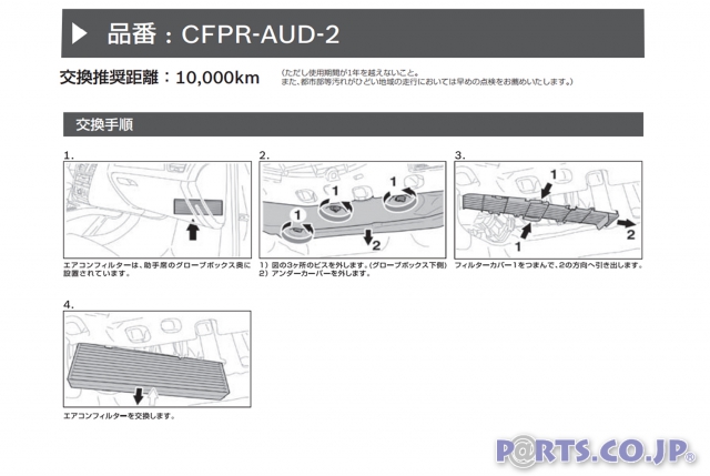 ※必ず適合(車種、年式、形式等)をご確認の上お買い求めください。※作業手順は例であり、左ハンドル車のイラストです。※正規輸入車を対象としており、並行輸入車では内容が異なる場合があります。 ※ハンドルの位置により、フィルターが付いている場所が異なる場合があります。※フィルター位置が異なる場合、AirFlow(風向)の向きが異なる場合があります。※製品の取扱説明書の「取付・使用上の注意事項」をお読みください。※使用済のエアコンフィルターを清掃して再利用することは出来ません。