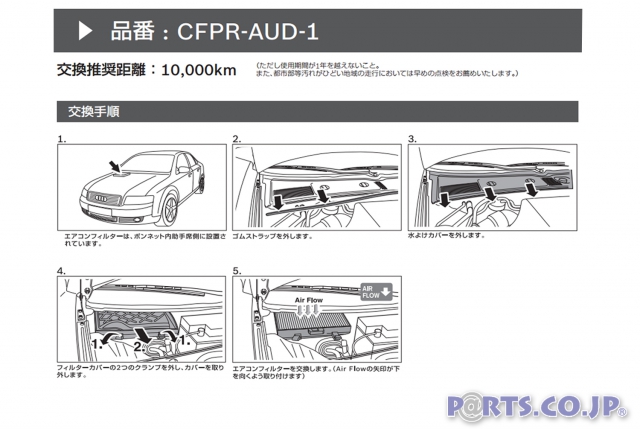 ※必ず適合(車種、年式、形式等)をご確認の上お買い求めください。※作業手順は例であり、左ハンドル車のイラストです。※正規輸入車を対象としており、並行輸入車では内容が異なる場合があります。 ※ハンドルの位置により、フィルターが付いている場所が異なる場合があります。※フィルター位置が異なる場合、AirFlow(風向)の向きが異なる場合があります。※製品の取扱説明書の「取付・使用上の注意事項」をお読みください。※使用済のエアコンフィルターを清掃して再利用することは出来ません.