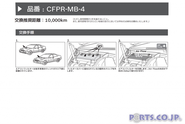 ※必ず適合(車種、年式、形式等)をご確認の上お買い求めください。※作業手順は例であり、左ハンドル車のイラストです。※正規輸入車を対象としており、並行輸入車では内容が異なる場合があります。 ※ハンドルの位置により、フィルターが付いている場所が異なる場合があります。※フィルター位置が異なる場合、AirFlow(風向)の向きが異なる場合があります。※製品の取扱説明書の「取付・使用上の注意事項」をお読みください。※使用済のエアコンフィルターを清掃して再利用することは出来ません.
