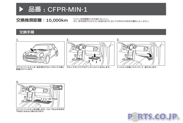 ※必ず適合(車種、年式、形式等)をご確認の上お買い求めください。※作業手順は例であり、左ハンドル車のイラストです。※正規輸入車を対象としており、並行輸入車では内容が異なる場合があります。 ※ハンドルの位置により、フィルターが付いている場所が異なる場合があります。※フィルター位置が異なる場合、AirFlow(風向)の向きが異なる場合があります。※製品の取扱説明書の「取付・使用上の注意事項」をお読みください。※使用済のエアコンフィルターを清掃して再利用することは出来ません.