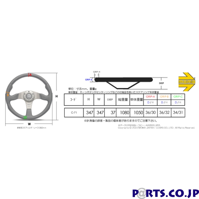 ●直径:347mm ●Dish:37mm ●カラー:ブラックグリップ/ブラックスポーク ●グリップタイプ:エアレザー ●オリジナルホーンボタン付属 ●取付ビスは付属しません(ボス側の付属ビスをご利用下さい) ●モモジャパンリミテッド正規品
