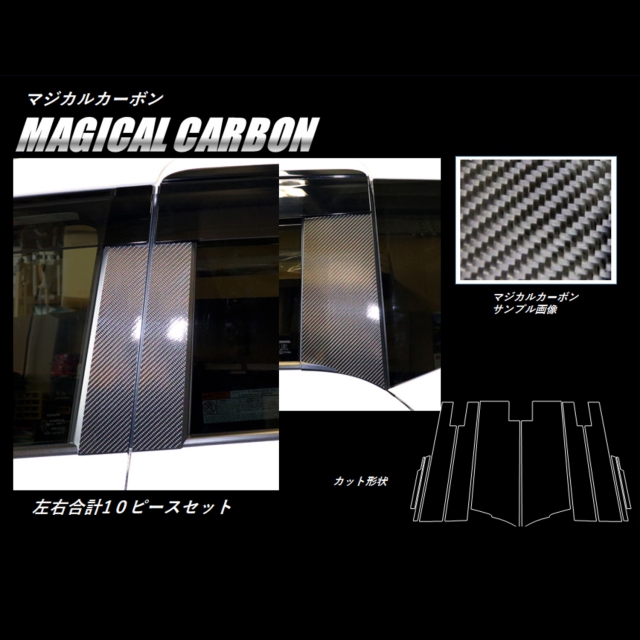 本物のカーボンを採用しながら自由にカットができ、曲面にも貼れるマジカルカーボン。リアルカーボンならではの質感は他製品を圧倒します。サイドピラーパネルにあわせてカット済みで貼り付けるだけで施工できます。