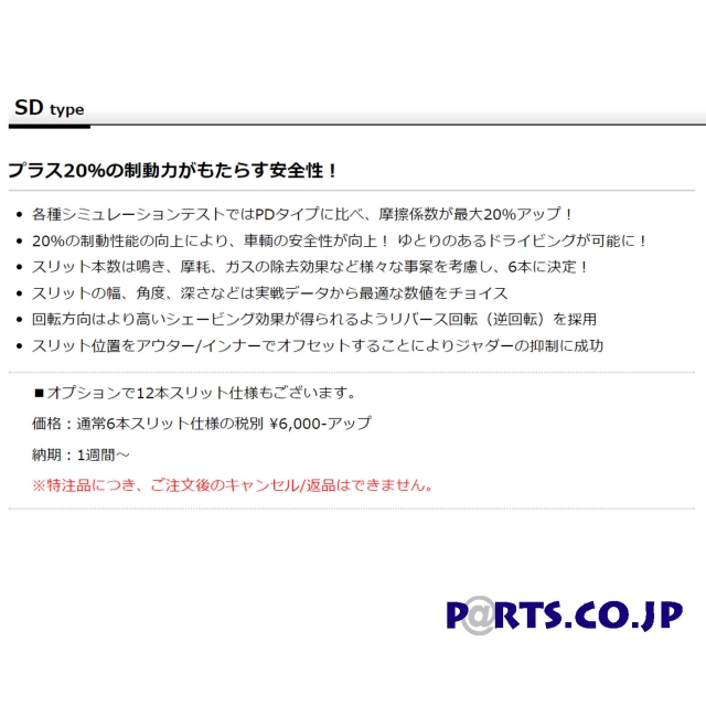 スリットの角度、深さなども実践データにより最適化。防錆コーティングを導入し錆の発生を抑制。ブレーキの効きを良くしたい・フィーリングに不満があるという方やワインディングやサーキット走行を楽しむ方にお勧め。※通常商品は6本スリットですが、12本スリット仕様への加工も承ります(加工費税別6000円)。ご注文時にお申し付けください。