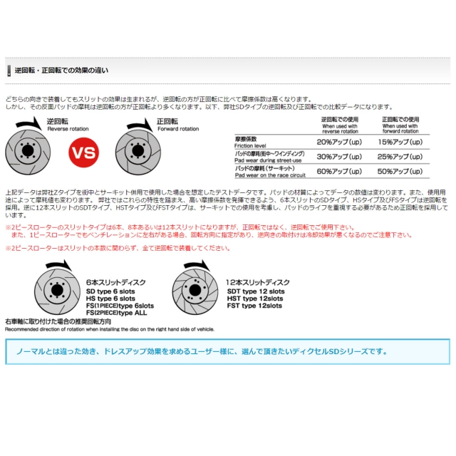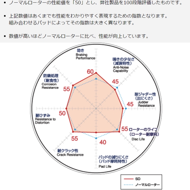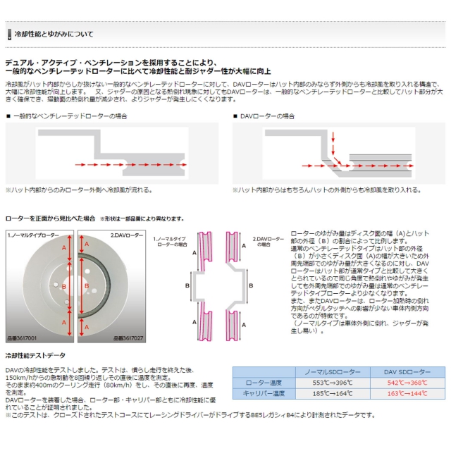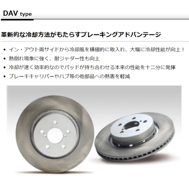 デュアル・アクティブ・ベンチレーテッドを採用することにより、一般的なベンチレーテッドローターに比べて冷却性能と耐ジャダー性が大幅に向上。スリットのシェービング効果により、パッドから発生するガスや粉をディスク表面より効率よく排出。およそ20%の制動性能が向上し高い食付き感が得られ、タッチも良くなります。
