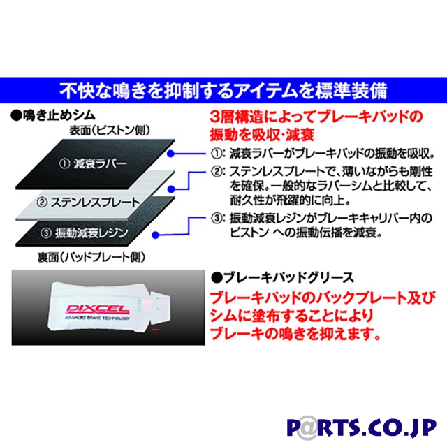 3層構造によってブレーキパッドの振動を吸収・減衰。ブレーキパッドのバックプレートにグリースが塗布することによりブレーキの鳴きを抑えます。