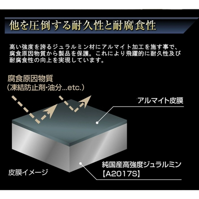素材・寸法・技術・・・すべての項目において、ワイドトレッドスペーサーのパイオニアとして蓄積したデータに基づいて最高の商品を完成させました。素材は高強度純国産ジュラルミン(A2017S)材を使用しています。さらに、硬質アルマイト加工を施す事によりスチール材同等の表面硬度を得ています。