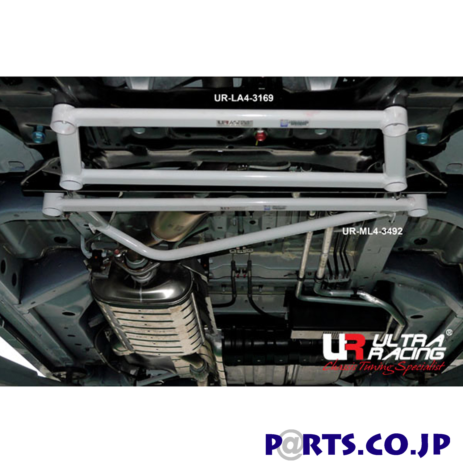 ウルトラレーシングのミドルメンバーブレースは中央のフロアトンネルを前後左右に補強し、ボディ中心部の剛性を高めます。中心部を補強することでボディ中心から捻じれ歪みを抑制し、バランスを保つ効果があります。また、経年劣化によるボディの歪みも抑制することが出来ます。フロントとリアの一体感がボディのふらつきを抑え、安定した高速走行や車線変更も可能であり、ハンドリング性能も向上します。