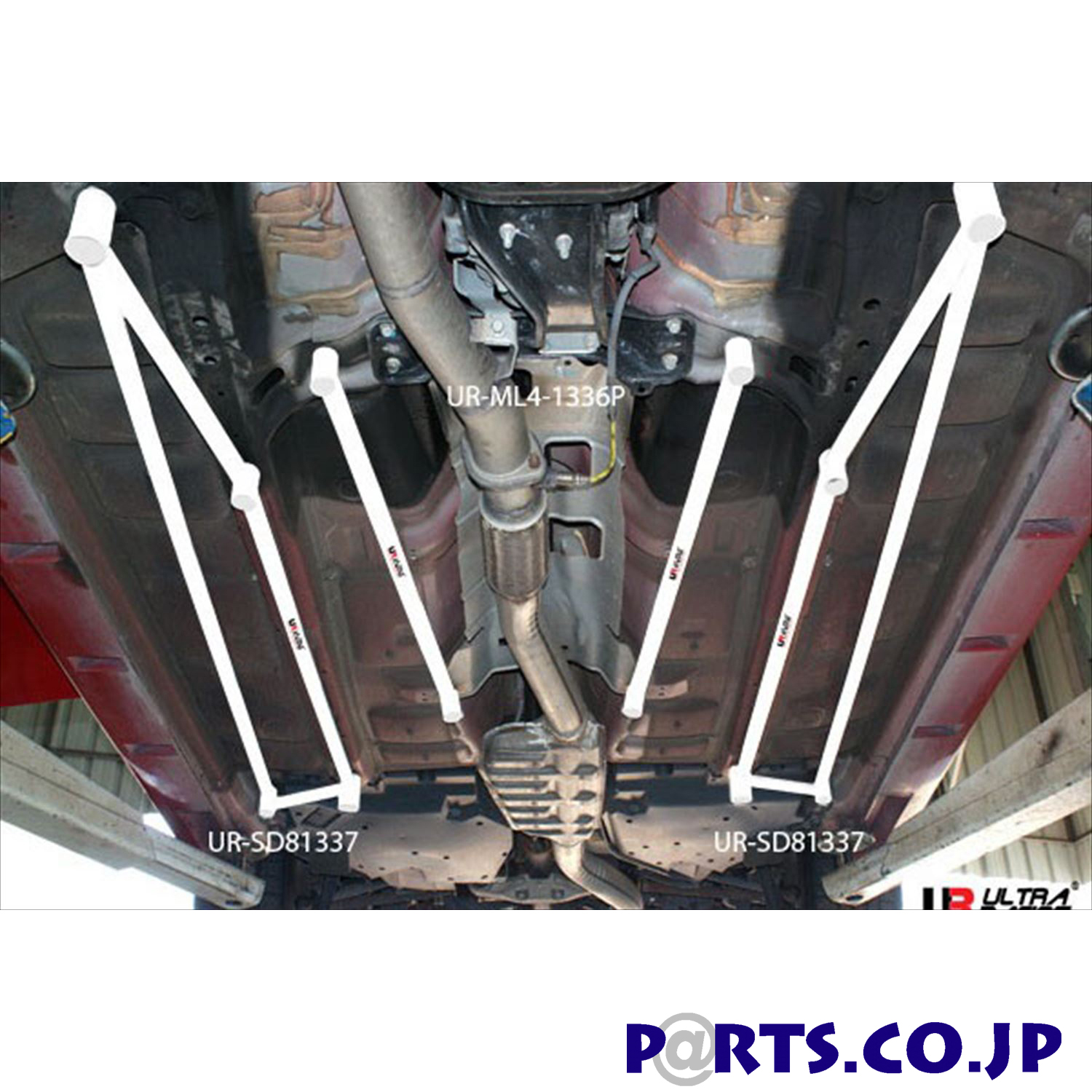 ウルトラレーシングのミドルメンバーブレースは中央のフロアトンネルを前後左右に補強し、ボディ中心部の剛性を高めます。中心部を補強することでボディ中心から捻じれ歪みを抑制し、バランスを保つ効果があります。また、経年劣化によるボディの歪みも抑制することが出来ます。フロントとリアの一体感がボディのふらつきを抑え、安定した高速走行や車線変更も可能であり、ハンドリング性能も向上します。