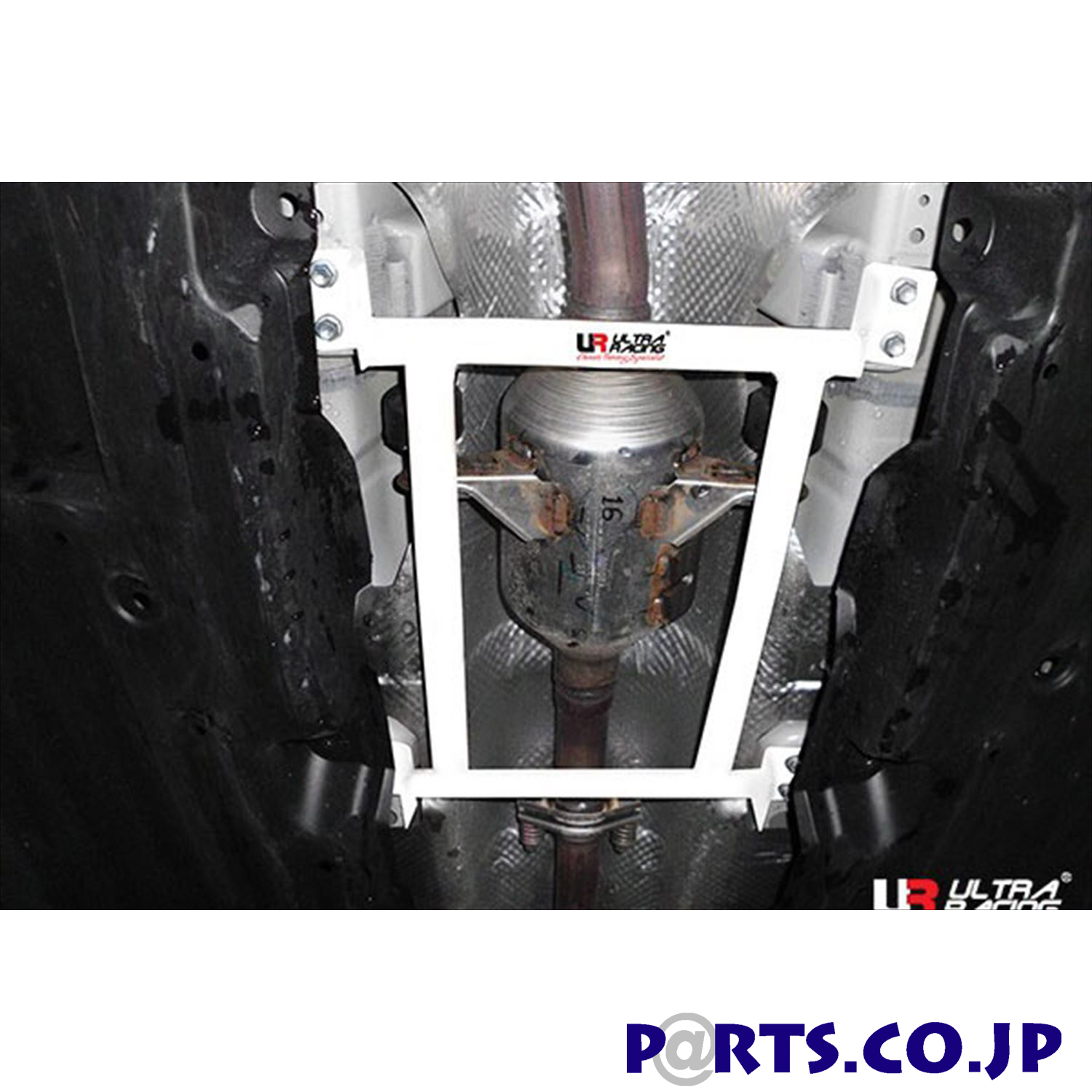 ウルトラレーシングのミドルメンバーブレースは中央のフロアトンネルを前後左右に補強し、ボディ中心部の剛性を高めます。中心部を補強することでボディ中心から捻じれ歪みを抑制し、バランスを保つ効果があります。また、経年劣化によるボディの歪みも抑制することが出来ます。フロントとリアの一体感がボディのふらつきを抑え、安定した高速走行や車線変更も可能であり、ハンドリング性能も向上します。