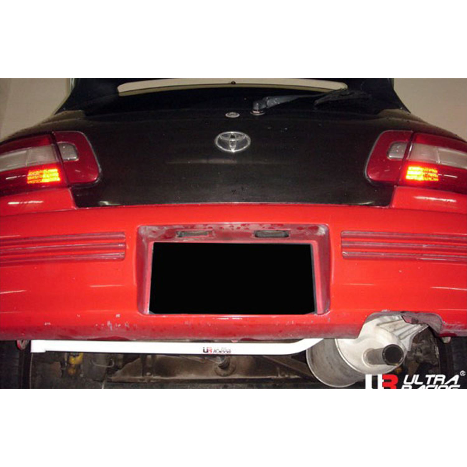 車体の後方左右を結合させ、リアバンパー付近の捻れを抑制することができます。リアの剛性を高めることにより、ふらつきや不安定感を抑制し、アンダーステア等の抑制にも繋がります。ウルトラレーシングの補強パーツは耐久性を考慮している為、材質は強度の高いスチールを採用しております。安全性を考え衝突事故などを想定し、他方の取付部分を破損させないよう衝撃を吸収出来る構造となっており、さらに、バーが厚すぎると衝撃を大きく受けてしまう為、厚みは1.2-1.6mmに設定しています。