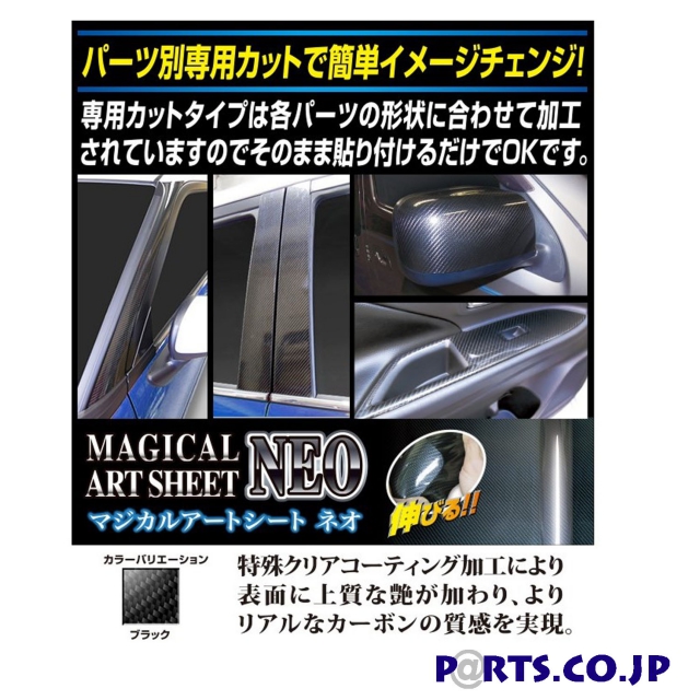 カーボンをリアルに再現し、さらに特殊クリアコーティング加工により、表面に上質な艶が加わりよりリアルなカーボンの質感を実現しました。 内装・外装どちらでも対応できるドレスアップシートで、特殊素材でとても伸びやすい為、細部までキレイに貼り付ける事が可能です