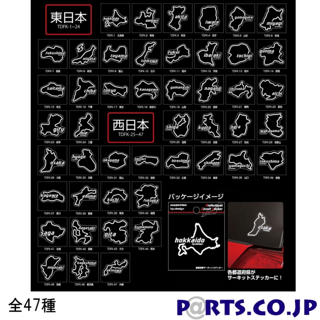 各都道府県の形をトレースしたサーキットコース図イメージのステッカー!郷土愛を満たすべく、47都道府県すべてを用意!