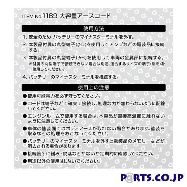 【仕様】・使用可能電力:DC12V480W以下/DC24V960W以下・コードサイズ:AV5.00sq-2m 【内容物】・アースコード:1本・丸型端子(5φ・6φ):各1個