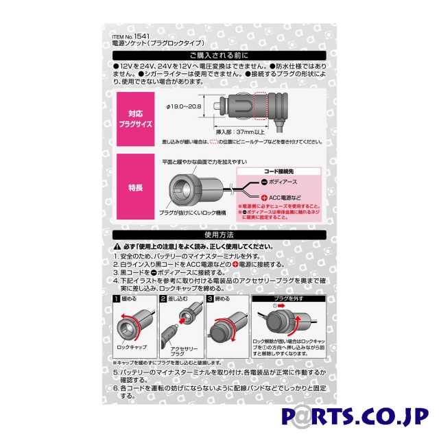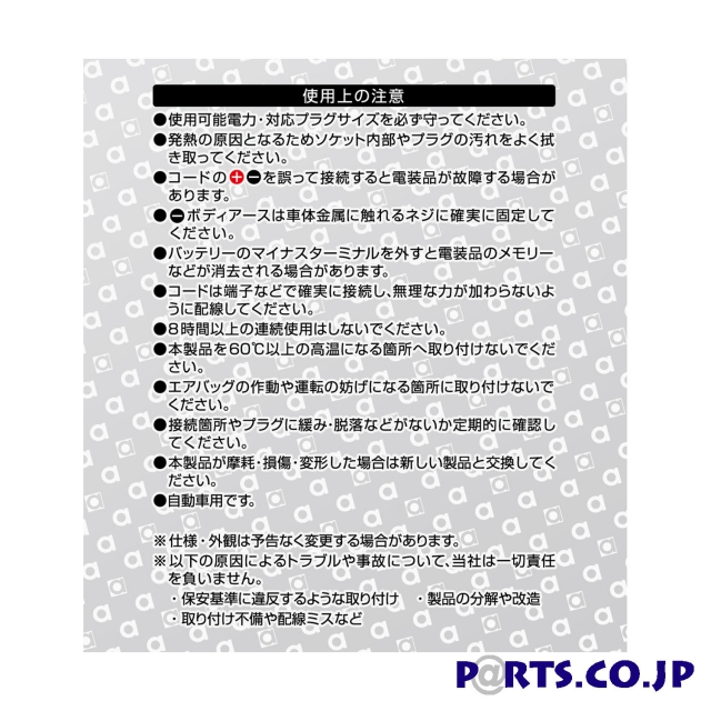 【仕様】・使用可能電力: DC12V車80W以下 DC24V車80W以下・コードサイズ:0.75sq相当-約1m