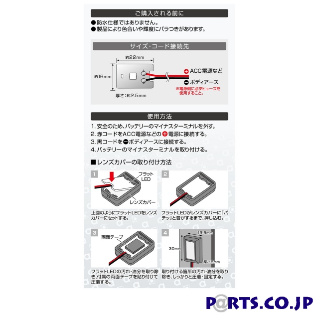 ■DC12V専用■LED1灯■発光色白:8000ケルビン(色温度)■消費電流20mA■コード太さ0.2sq相当■コードの長さ200mm■専用レンズカバー付属■両面テープ付属■レンズカバーサイズ幅19.5X高さ30X厚さ8mm■材質・本体/ABS・レンズ/アクリル・コード/導体:電気用軟銅線・絶縁被覆:塩化ビニール・両面テープ/基材:発泡ポリエチレン・粘着剤:アクリル系粘着剤■入り数1セット