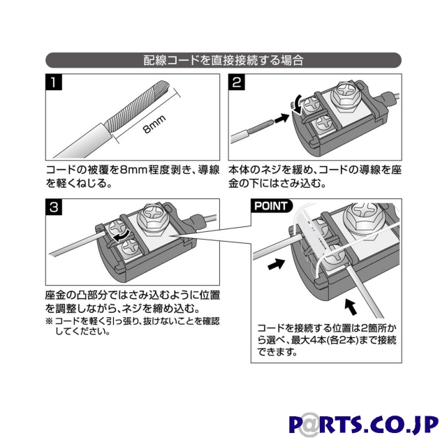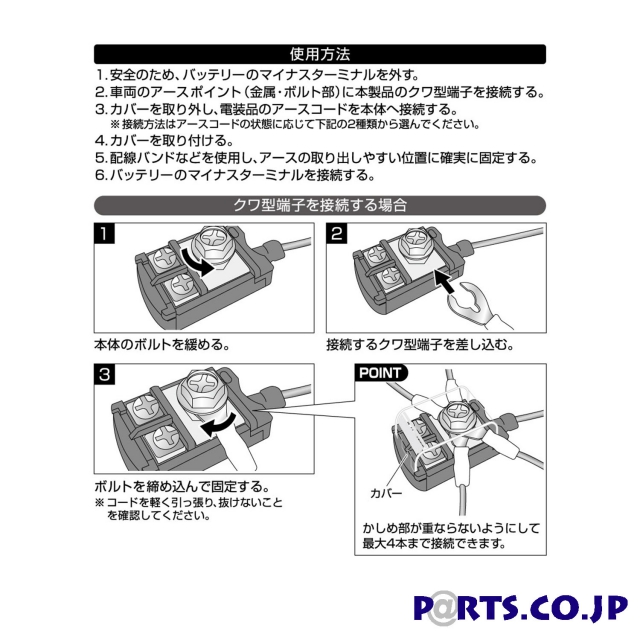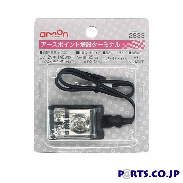 【仕様】・使用可能電流(接続コードの合計値) DC12V140W以下/DC24V280W以下・付属コードサイズ:1.25sqX約30㎝・クワ型端子サイズ:6φ・最大8本接続可能 配線コード:0.2~0.75sqX4本(各2本) クワ型端子:6φX4本 【内容物】・アースポイント増設ターミナル:1個