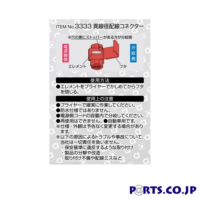 【仕様】・使用可能電力:DC12V車 110W以下DC24V車 220W以下・適合コードサイズ:電源側 AV(S)0.75 2sq分岐側 AV(S)0.3 0.75sq