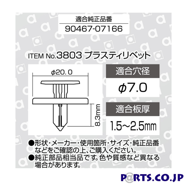 【仕様】・適合穴径:φ7.0・適合板厚:1.5 2.5mm・適合メーカー:トヨタ・適合純正品番90467-07166
