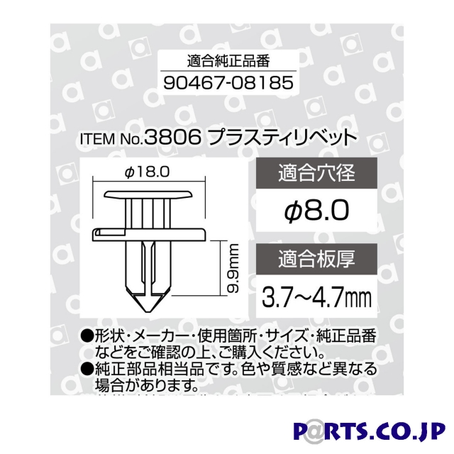 【仕様】・適合穴径:φ8.0・適合板厚:3.7 4.7mm・適合メーカー:トヨタ・適合純正品番90467-08185