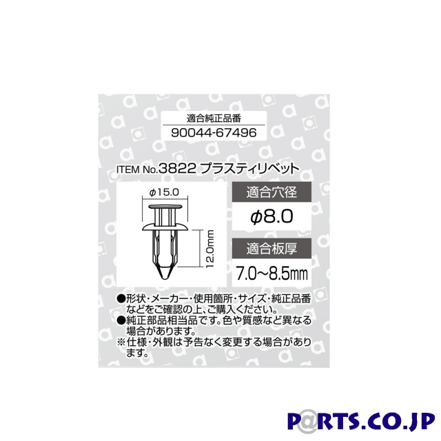 【仕様】・適合穴径:φ8.0・適合板厚:7.0 8.5mm・適合メーカー:ダイハツ・適合純正品番90044-67496