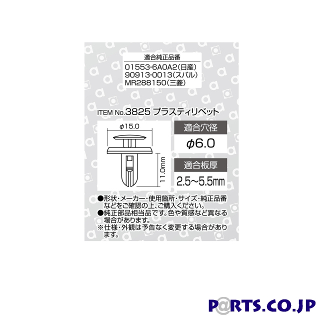【仕様】・適合穴径:φ6.0・適合板厚:2.5 5.5mm・適合メーカー:日産・スバル・三菱・適合純正品番01553-6A0A2(日産)90913-0013(スバル)MR288150(三菱)