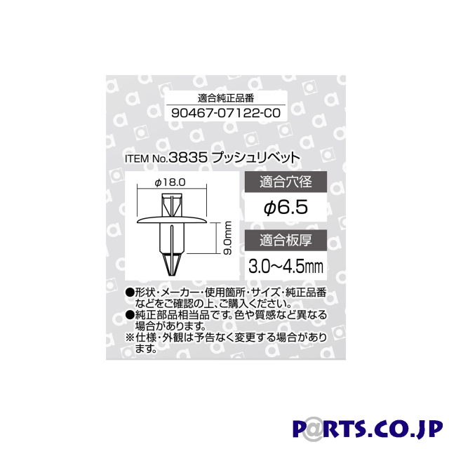 【仕様】・適合穴径:φ6.5・適合板厚:3.0 4.5mm・適合メーカー:トヨタ・適合純正品番90467-07122-C0