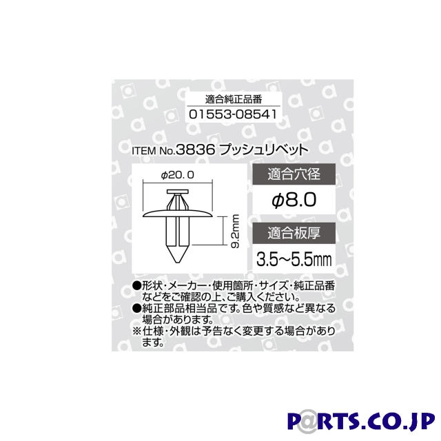 【仕様】・適合穴径:φ8.0・適合板厚:3.5 5.5mm・適合メーカー:日産・適合純正品番01553-08541