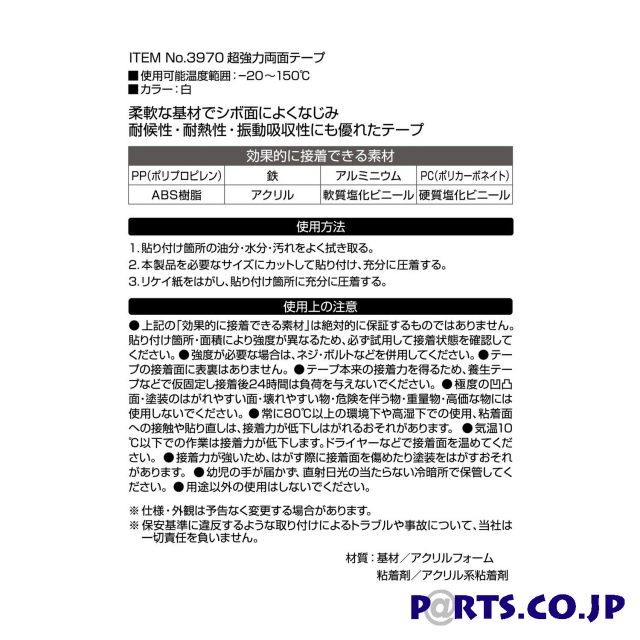 サイズ:幅10mm×長さ1m×厚さ1.1mmPP対応(ポリプロピレン)使用可能温度範囲:-20~150℃カラー:白材質:基材/アクリルフォーム 粘着剤/アクリル系粘着剤