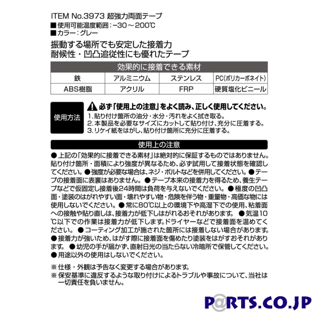 車外用振動する場所でも安定した接着力耐候性・凹凸追従性にも優れたテープ【効果的に接着できる素材】鉄・アルミニウム・ステンレス・PC(ポリカーボネイト)・ABS樹脂・アクリル・FRP・硬質塩化ビニール※製品の仕様は予告なく変更する場合がございます。※ご購入の前にホームページをご確認ください。