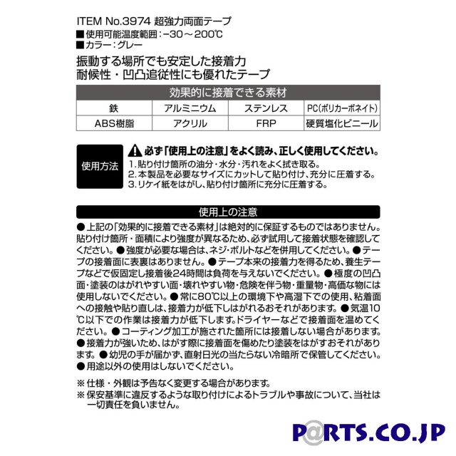 車外用振動する場所でも安定した接着力耐候性・凹凸追従性にも優れたテープ【効果的に接着できる素材】鉄・アルミニウム・ステンレス・PC(ポリカーボネイト)・ABS樹脂・アクリル・FRP・硬質塩化ビニール※製品の仕様は予告なく変更する場合がございます。※ご購入の前にホームページをご確認ください。
