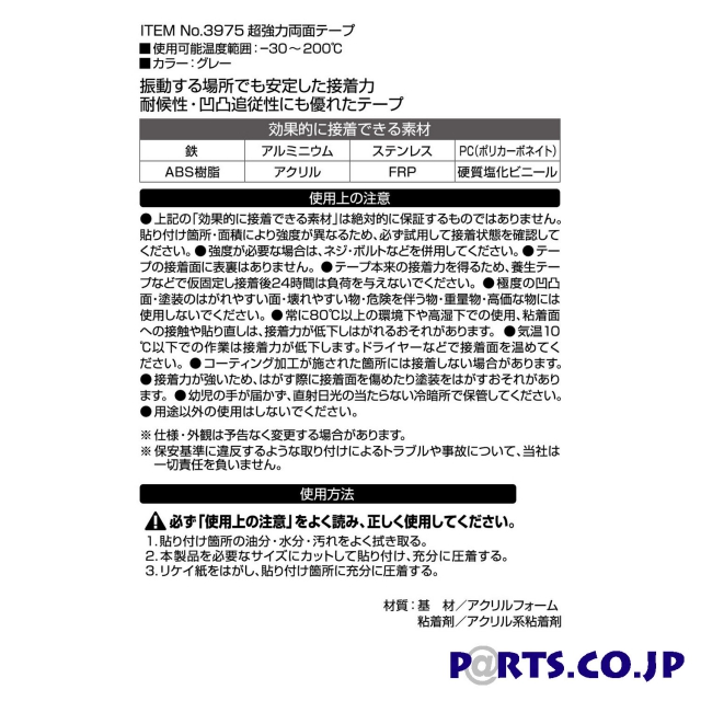 車外用振動する場所でも安定した接着力耐候性・凹凸追従性にも優れたテープ【効果的に接着できる素材】鉄・アルミニウム・ステンレス・PC(ポリカーボネイト)・ABS樹脂・アクリル・FRP・硬質塩化ビニール※製品の仕様は予告なく変更する場合がございます。※ご購入の前にホームページをご確認ください。