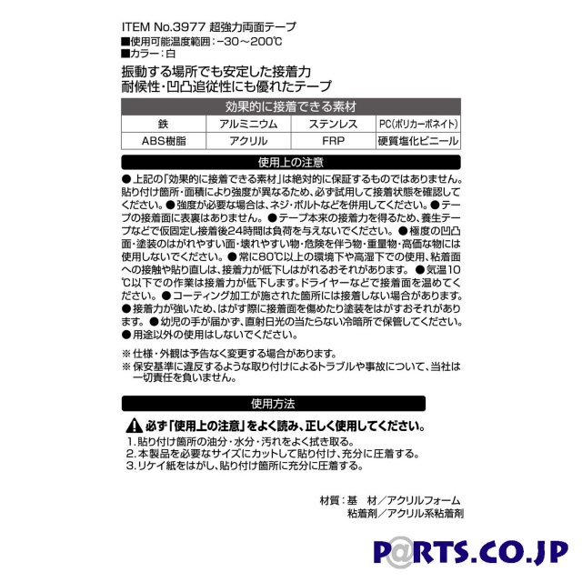 車外用振動する場所でも安定した接着力耐候性・凹凸追従性にも優れたテープ【効果的に接着できる素材】鉄・アルミニウム・ステンレス・PC(ポリカーボネイト)・ABS樹脂・アクリル・FRP・硬質塩化ビニール※製品の仕様は予告なく変更する場合がございます。※ご購入の前にホームページをご確認ください。